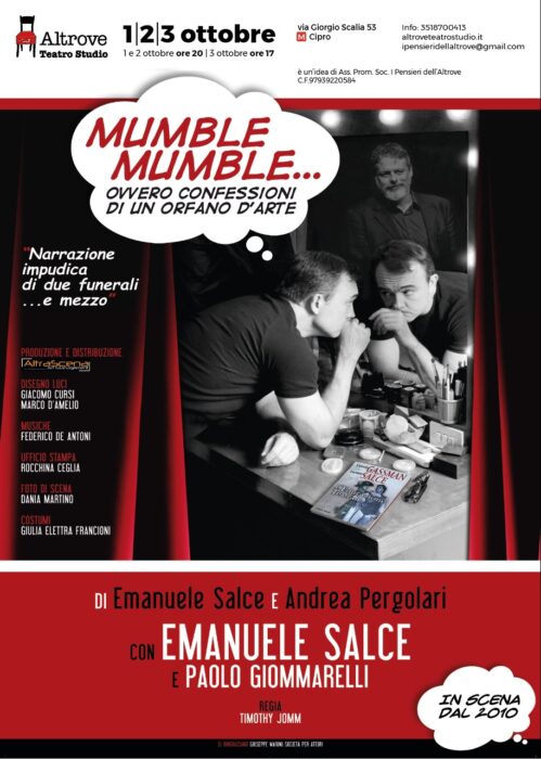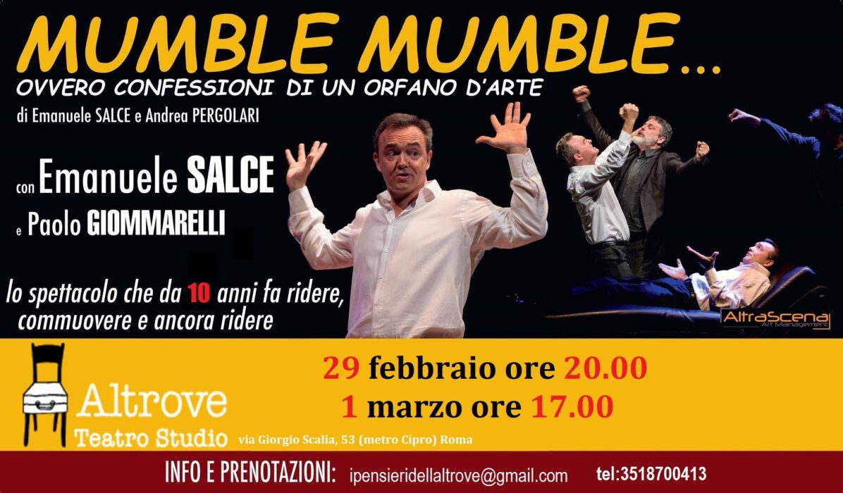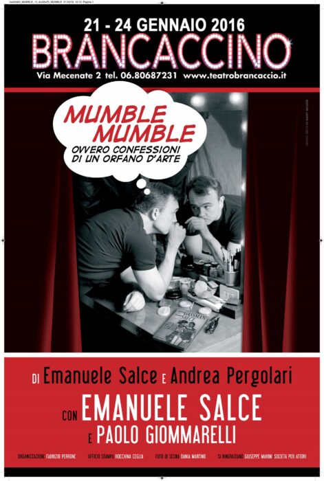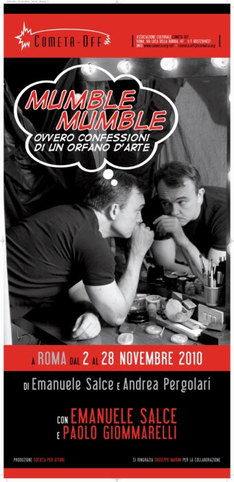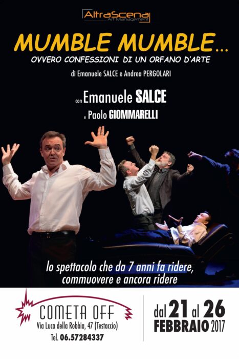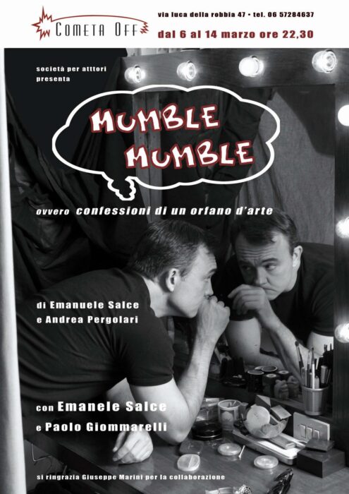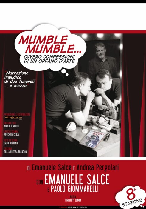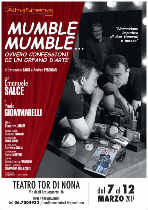 Un atto unico per tre storie irripetibili, il cui narratore, per molto tempo, era rifuggito dalla vita di quei palcoscenici di cui nemmeno voleva sentire l’odore. Questo è Mumble Mumble di Emanuele Salce, Confessioni di un orfano d’arte, e due sono i padri: quello naturale è Luciano Salce, quello putativo è Vittorio Gassman. Ed è proprio a causa di questo doppio, turbolento “magistero”, rimpianto e temuto insieme, che l’attore si ritrova alla perpetua ricerca di una trama; e per la medesima ragione, egli prova a nascondersi dietro la potente verità di Dostoevskij, finché un vero amico-regista (Paolo Giommarelli) gli dice di lasciar perdere, perché nulla avrebbe senso, niente sarebbe reale, se non lui stesso. Lasciati andare! lo esorta. Dapprima quello finge di non capire, poi si persuade senza crederci appieno, infine si tuffa a corpo vivo nella sua trascorsa esperienza. E la memoria si riattiva a partire da una piovosa alba di dicembre quando, rientrato da una nottata di alcool e di bagordi, Emanuele viene investito da una torrenziale segreteria telefonica, che lo avvisa, a più voci, della morte di Luciano, del padre accanto a cui egli sapeva sorridere. Quel figlio ha appena ventidue anni ed è la prima volta che un lutto primario lo colpisce d’improvviso alla schiena. La scena che segue è comicamente italiana, ambientata nella casa dove l’Artista si è da poco spento, tra amici di famiglia, becchini e para-parenti che si condolgono con l’unico orfano, presente e confuso dinanzi alla parata della morte. Ed è tutto molto ridicolo, come la morte in verità è, qualora la si voglia raccontare per filo e per segno. Come sarà epicamente, buffamente solenne l’uscita di scena del padre-mattatore. Stavolta è Estate piena e per l’occasione, attorno alla salma di Vittorio Gassman, si accalca una folla di colleghi e di comprimari, di politici e di prelati, tutti a sommergere, quasi a tacerlo, il naturale patimento di moglie e figli. In quell’appartamento al centro di Roma il Potere e le Arti, autentiche o meno che fossero, andranno a braccetto per un intero pomeriggio di esibito dolore, litigandosi il primato del Congedo, l’estremo saluto all’Attore “mai impallato”.