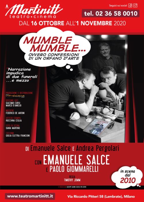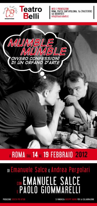 Mumble mumble – ovvero confessioni di un orfano d’arte nasce nel 2009, quasi per caso, quando la direzione artistica di un teatro privato milanese, dopo avermi visto in un’intervista tv, mi offrì di fare una serata nel loro spazio estivo. “Vorremmo conoscerla artisticamente” fu la proposta. Non mi era mai successo in precedenza, facevo l’attore seriamente da poco ed avevo fatto solo due, tre spettacoli prima d’allora (di cui la metà trascurabili…). Ero molto gratificato e spaventato al tempo stesso. Potevo fare quello che volevo mi dissero: “qualcosa dal suo repertorio (io non avevo un repertorio), una lettura, scelga lei…”. Il primo istinto fu quello di cercare supporto nei classici: “La mite” di Dostoevskji era sempre stato uno dei miei racconti preferiti. Optai per quello senza indugi. Ma poi, per enorme senso di gratitudine verso questi signori sconosciuti che mi offrivano questa inaspettata e gratificante possibilità, tornai sui miei passi e, ritenendo di dover fare qualcosa di più per poter contraccambiare adeguatamente la generosa offerta, aprii il rubinetto dei miei ricordi più intimi senza indugi e venne fuori tutto, tutto ciò che avevo di più intimo dentro di me: ricordi di persone care scomparse, momenti intimi di quasi felicità come momenti imbarazzanti. Tutte esperienze di vita vissuta in prima persona, da me. Ma pochi giorni prima dell’andata in scena, accadde l’inaspettato. Lo stesso teatro che mi aveva tanto cercato, ingaggiato e tanto incoraggiato a farmi conoscere artisticamente presso il suo spazio, decise di censurarmi! La direzione artistica ritenne infatti volgare ed impresentabile il mio terzo racconto, si dissero scandalizzati ed offesi da alcuni riferimenti scatologici in esso contenuti. Inutile dire che ci rimasi malissimo. Non riuscivo a farmene una ragione. Il mio produttore mi disse di non farne un dramma e che mi avrebbe offerto di metterlo in scena comunque per qualche serata all’interno di una sua rassegna di testi inediti che si sarebbe tenuta qualche mese più tardi. E lì accadde l’imponderabile, lo spettacolo ebbe un successo insperato (almeno da me), registrammo persino degli esauriti e ci fu proposto di replicare per tutta la settimana successiva. A Roma si sparse in fretta la voce che accadeva qualcosa di molto interessante nel nostro teatrino, venne chiunque, dai colleghi agli impresari. Finché uno di questi decise subito di prenderlo e metterlo nel suo cartellone l’anno successivo. Da lì parte l’avventura di questo piccolo spettacolo che finisce per diventare così quasi grande e ad andare in scena ancora oggi, dopo cinque stagioni, girando l’Italia con enorme consenso di pubblico ed innumerevoli recensioni positive. A volte si dice che nella vita, quando si chiude una porta poi si apre un portone. Per noi andò proprio così. E per certi aspetti devo molta gratitudine a quella censura. Senza di essa non avrei mai partecipato alla rassegna di testi inediti e lo spettacolo sarebbe nato e morto quella stessa sera. Per la cronaca, quel teatro ha interrotto la sua programmazione pochi anni dopo, mentre il mio racconto, oggetto di scandalo e censura, è finito nell’ultimo romanzo di Sandro Veronesi con tanto di dedica e complimenti.
